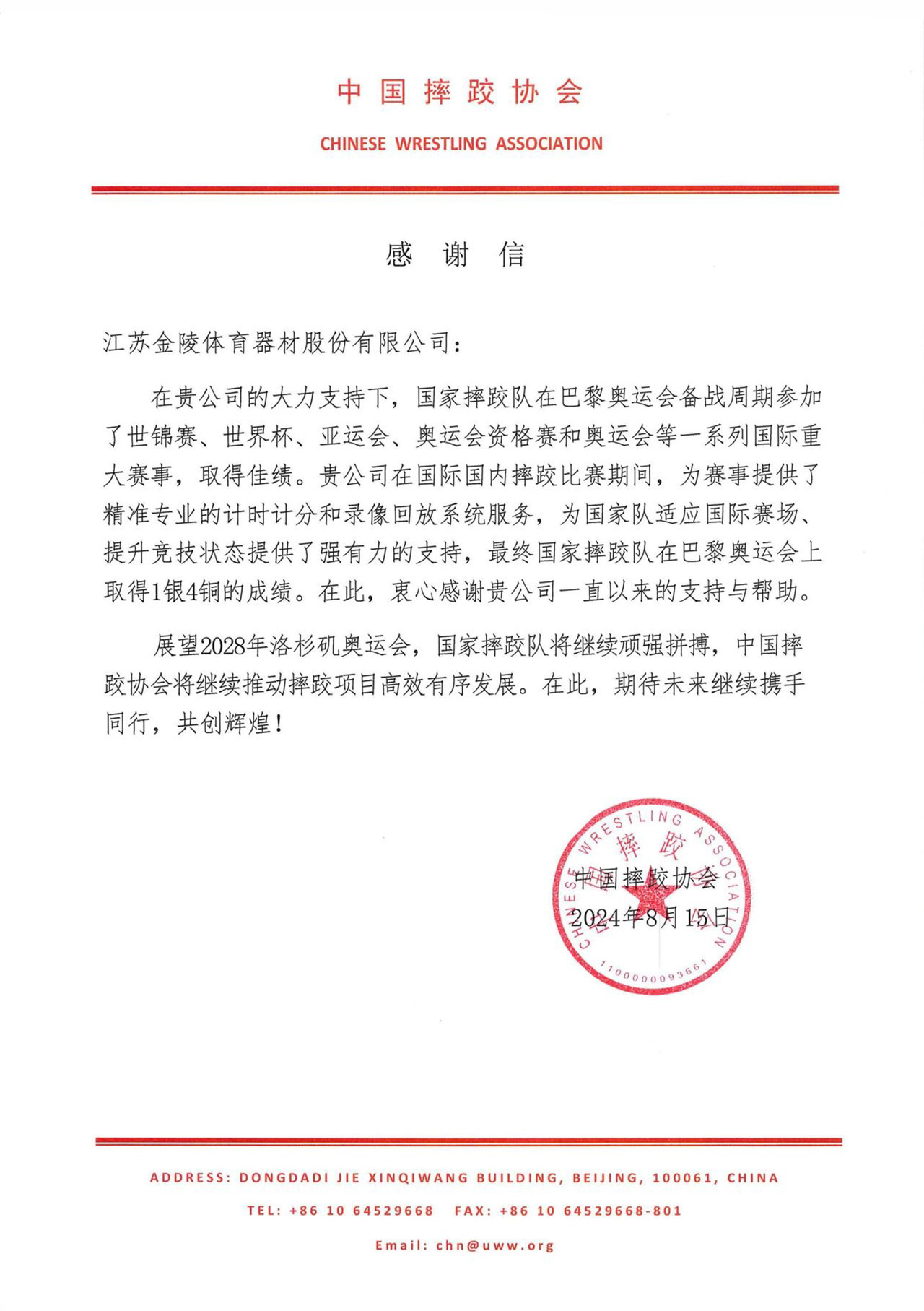 信中說:在貴公司的大力支持下,國家摔跤隊在巴黎奧運會備戰(zhàn)周期參加了世錦賽、世界杯、亞運會、奧運會資格賽和奧運會等一系列國際重大賽事,取得佳績。貴公司在國際國內摔跤比賽期間,為賽事提供了精準專業(yè)的計時計分和錄像回放系統(tǒng)服務,為國家隊適應國際賽場,提升競技狀態(tài)提供了強有力的支持,最終國家摔跤隊在巴黎奧運會上取得1銀4銅的成績。在此,衷心感謝貴公司一直以來的支持與幫助。